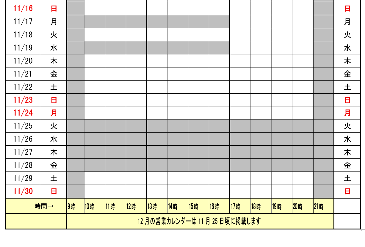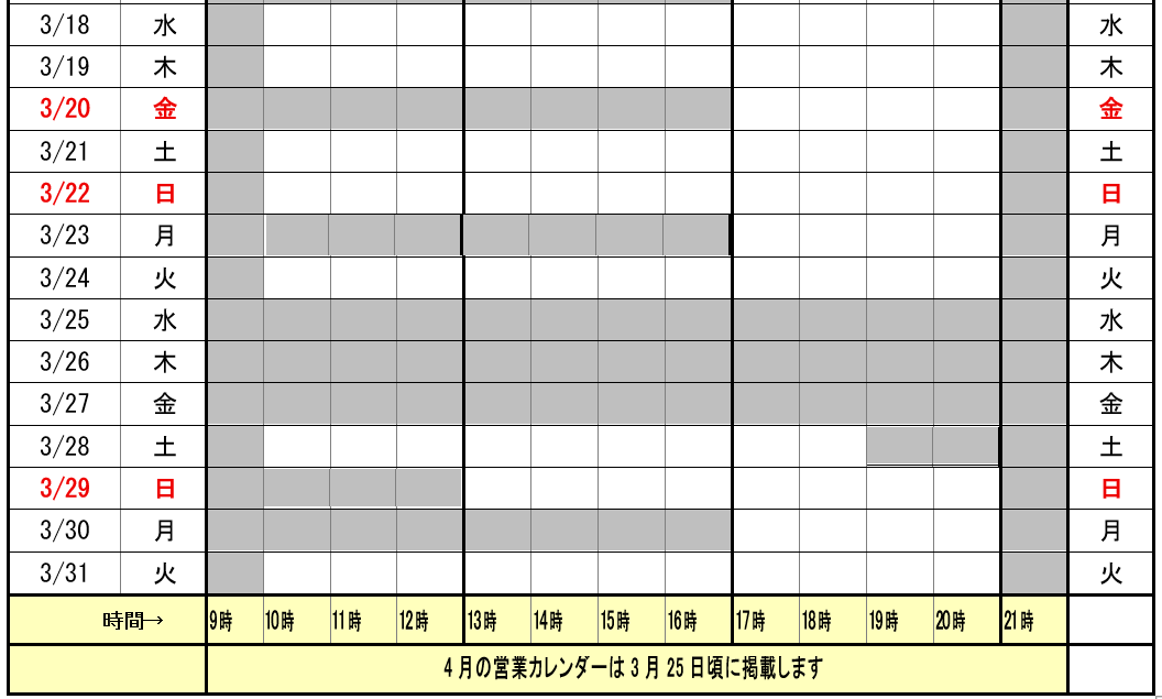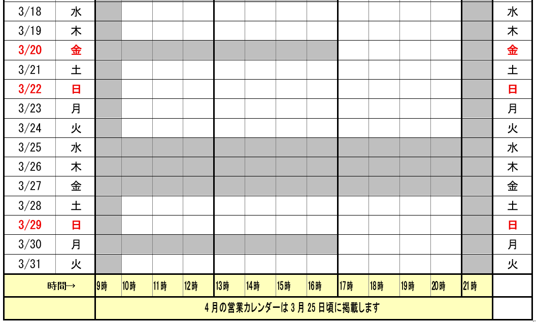 | 営業日 | 上の営業時間カレンダーをご覧ください。土曜日・日曜日・祝日も営業しております |