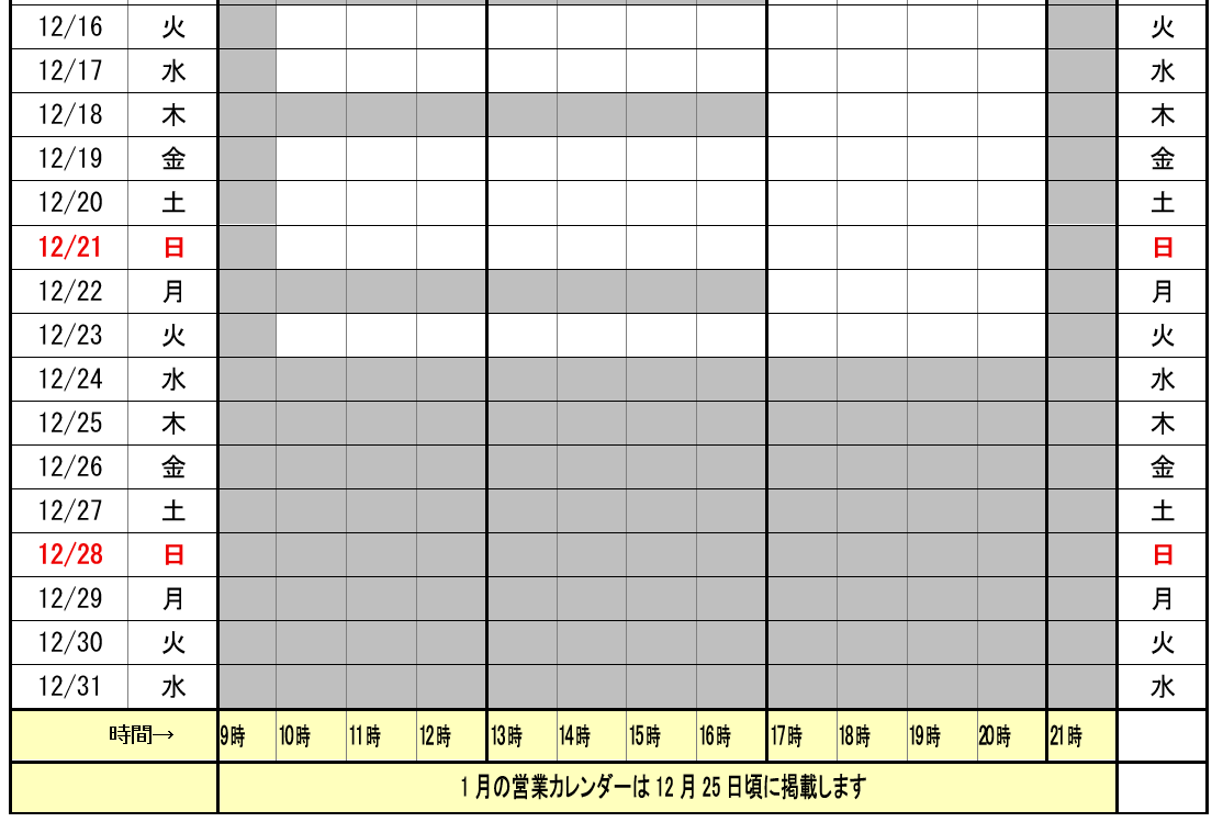 | 営業日 | 上の営業時間カレンダーをご覧ください。土曜日・日曜日・祝日も営業しております |